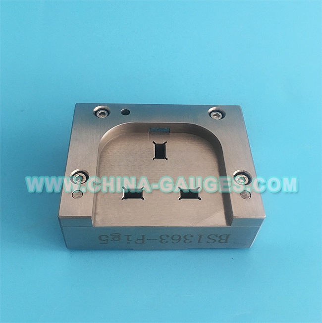 Plug location and size gauge (BS1363-3 Figure 5). Plug test sample uses the gauge to check whether the relative position and the length of the pin as well as its joint surface with the plug whether it is fit to the standard requirements.